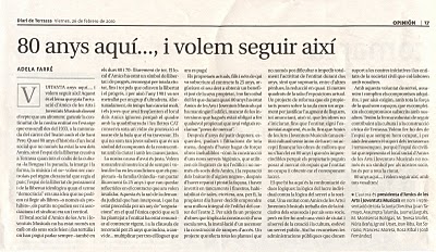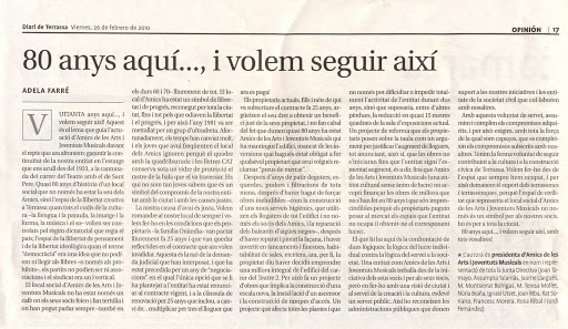 Que quedi clar que no em queixo per un ajut denegat. Amics de les Arts i Joventuts Musicals fa anys que rep el suport de l’Ajuntament de Terrassa i d’altres institucions, a més de diverses entitats privades, per tal de dur endavant els seus projectes. I el nostre Festival de Jazz i la nostra Big Band Jazz Terrassa reben un suport decidit de l’ICIC (Institut Català d’Indústries Culturals). És només que tenim la impressió de tenir a sobre un sostre de vidre que no ens permet anar més enllà en alguns projectes, perquè aquests no encaixen en el pobre esquema que tenen les administracions de la cultura que s’ha de promoure. En el marc local el límit el marca l’ecosistema social de cada ciutat, perquè més enllà de l’interès intrínsec de cada proposta compta sobretot el nombre d’entitats i la necessitat que tothom se senti reconegut i tingut en compte; en el marc autonòmic i estatal, la línia la marca la frase de la ministra, d’una banda, és a dir, l’impuls que des de la política es vol donar a l’economia de la cultura i, de l’altra, el suport als elements distintius de la cultura pròpia, és a dir a les manifestacions de cultura popular i tradicional, des dels esbarts i La Passió fins als castellers i el Tradicionarius.